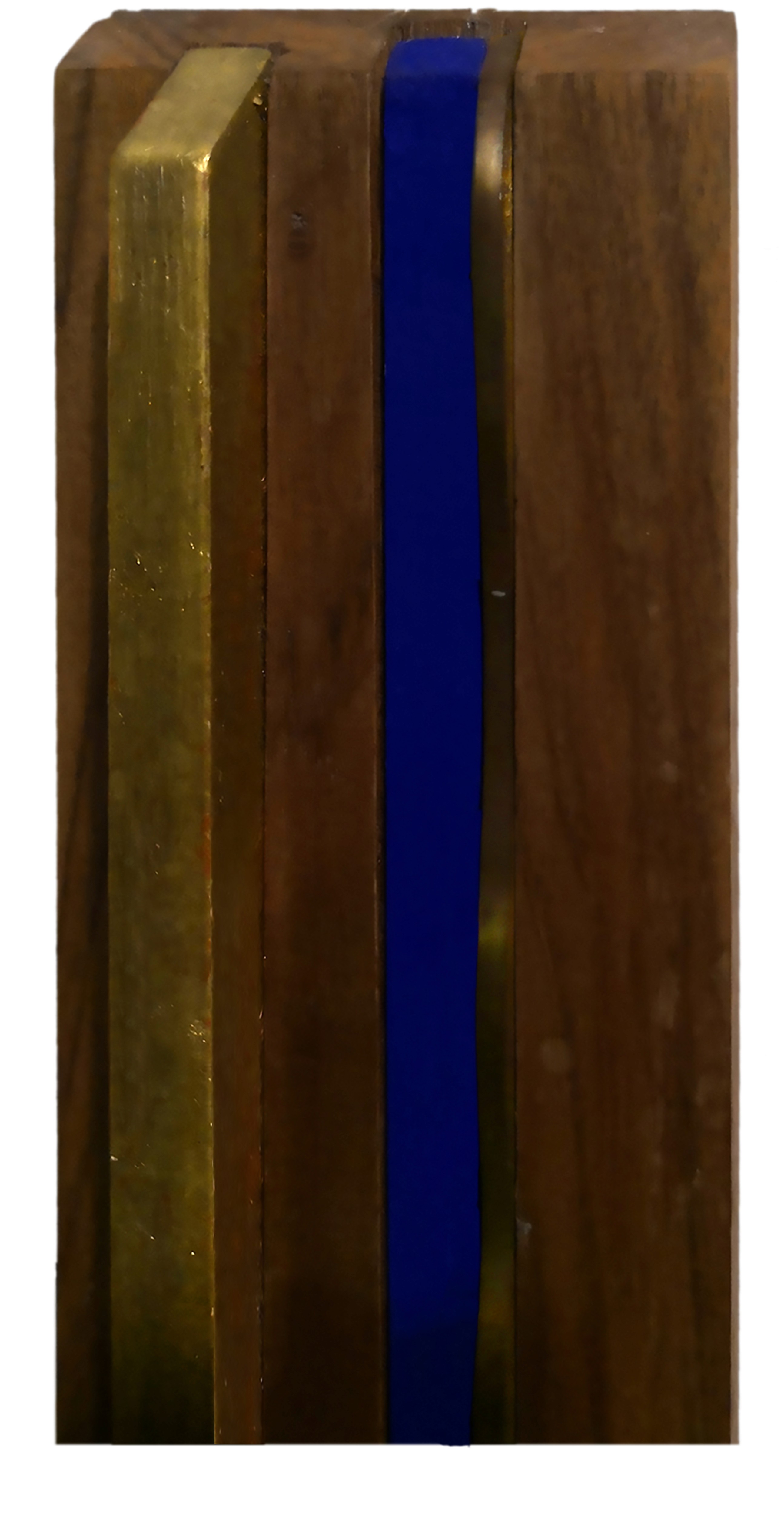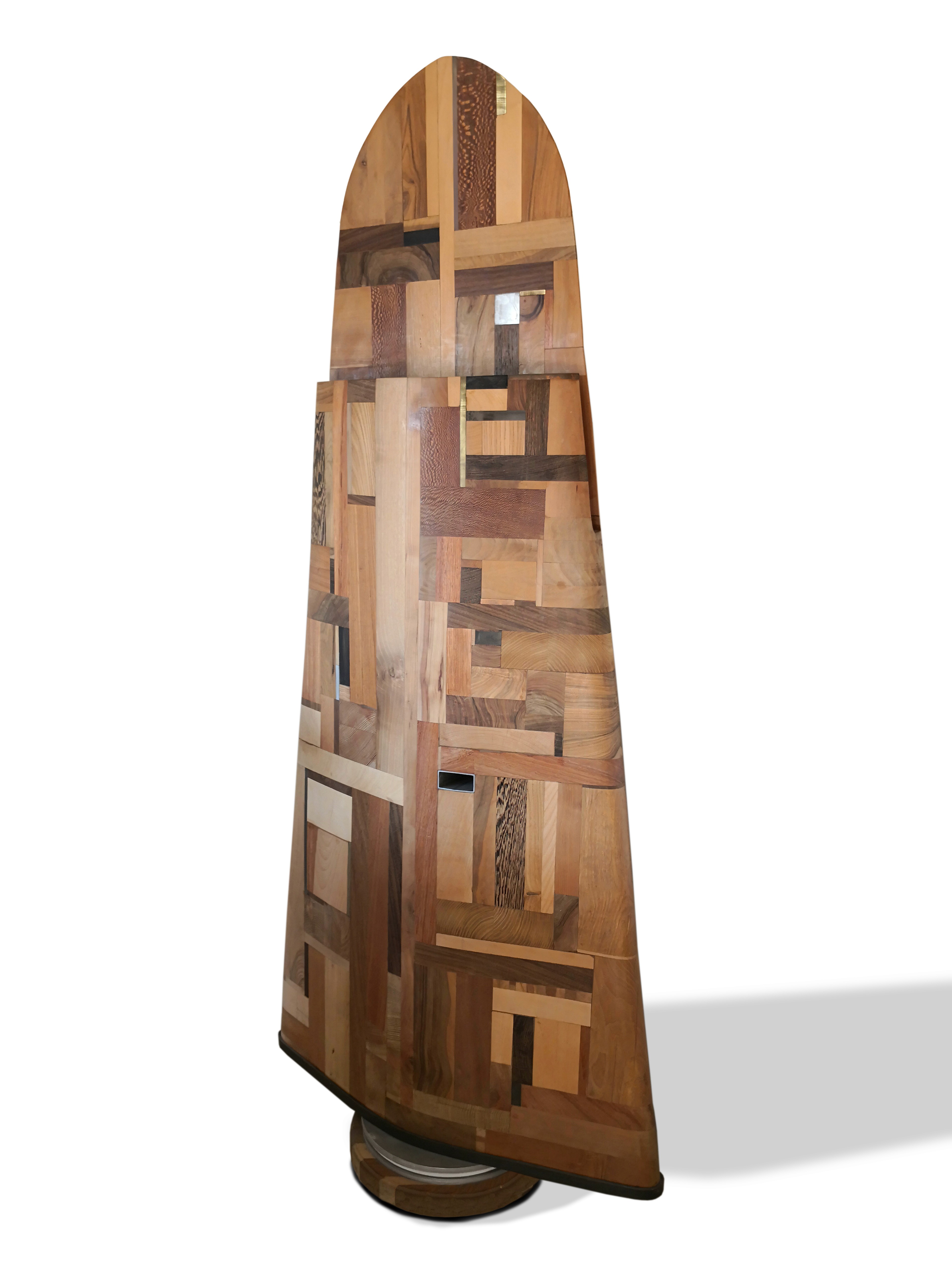 Composizione in legni misti, ferro, ottone, rame, alluminio, plexiglass,